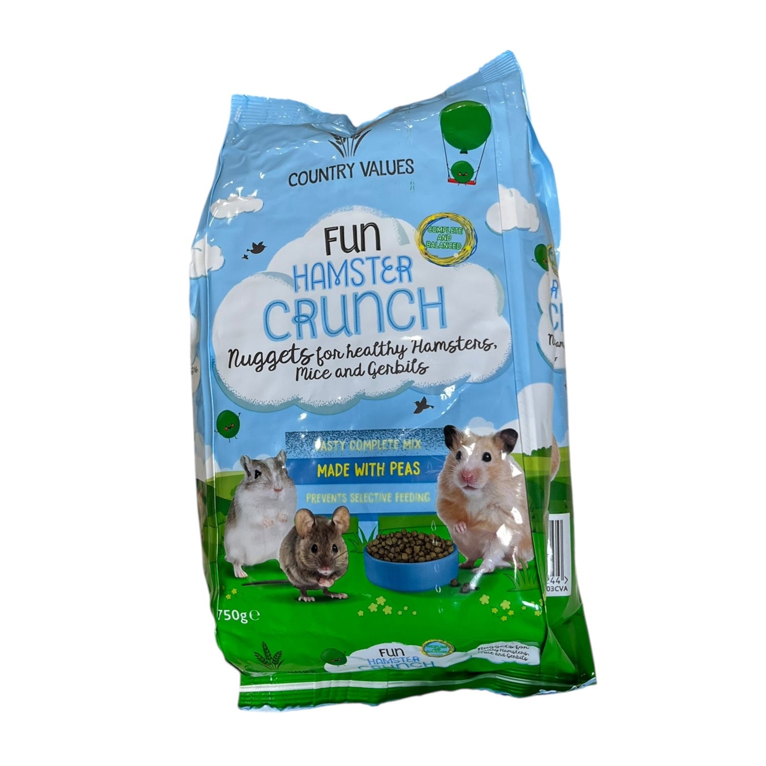 Country Values Fun Hamster Crunch for hamsters, mice and gerbils is a nutritionally balanced and complete pet food, made with peas for extra tastiness. Plus our complete nuggets prevent your pets from selectively feeding!